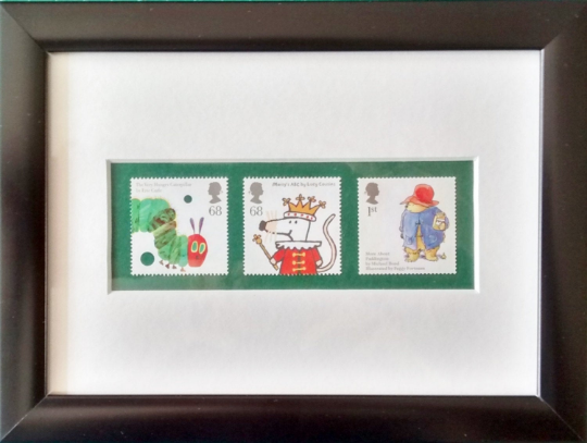 These are delightful framed postage stamps for children from the 2006 set of 'Animal Tales' stamps. The three stamps are genuine mint UK stamps and show children's favourite characters from The Very Hungry Caterpillar by Eric Carle, Masie's ABC by Lucy Cousins and More About Paddington Bear by Michael Bond.