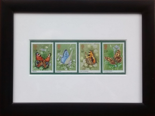 Butterfly framed stamps, these Framerstamp framed stamps made with genuine stamps from 1981 show 4 beautiful butterflies: Small tortoiseshell, Large blue, Peacock and Chequered Skipper.