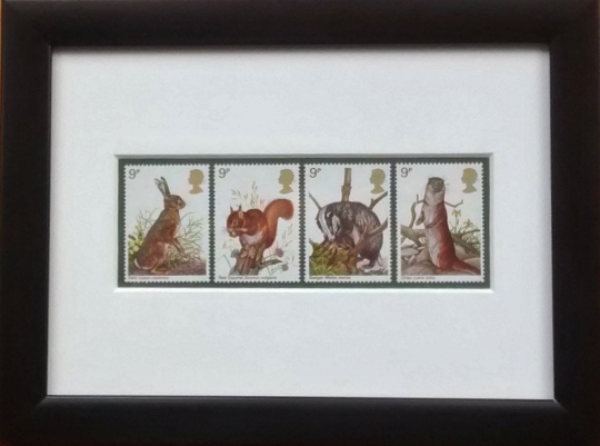 Issued in 1977 these framed stamps make a great gift for lovers of nature and supporters of wildlife. These four stamps show a hare, a red squirrel, an otter and a badger.