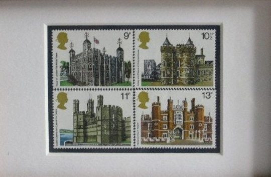 These framed postage stamps from 1980 show four of the much loved castles in the UK: The Tower of London, Holyrood house in Edinburgh, Caernarvon Castle in Wales and Hampton Court in London.