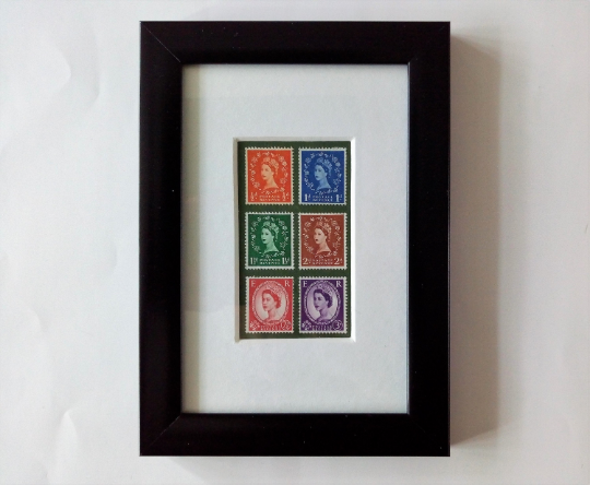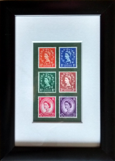 Framed British mint stamps of Queen Elizabeth 2nd, issued from 1952 to 1966, make a really original gift. The stamps are known as Wildings as they were named after Dorothy Wilding who designed each of the stamps. Though the stamp design continued until 1967 the colour of some stamps varied across the years. The values of the stamps shown in pre-decimal currency are half d, 1d, one and a half d, 2d, 2and a half d and 3d. Five pence in today's money would be worth 12d in pre-decimal currency which was changed to decimal, as we know it today, in 1971. It also seems amazing to think that the Queen was the reigning monarch all these years ago and still is today.