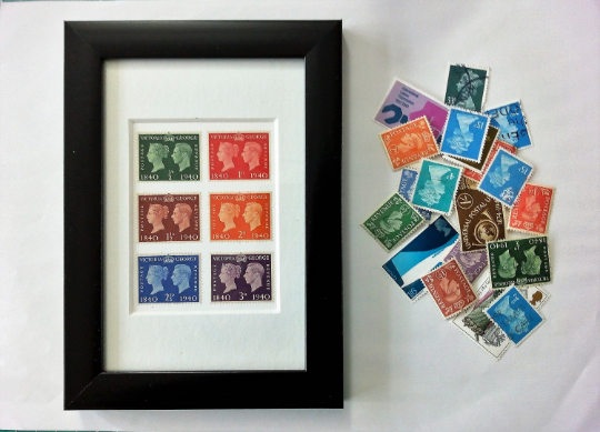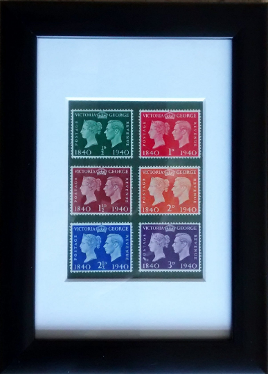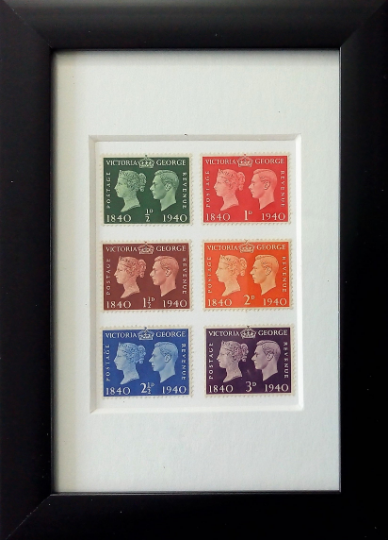 Framed genuine mint postage stamps issued in 1940 for the Centenary of the first British postage stamp. This was the Penny Black which was issued in 1840. The stamps show King George 6th and Queen Elizabeth, the Queen Mother who were the parents of Queen Elizabeth 2nd. The stamps were probably designed and printed in good time in 1939 before the start of World War 2. During the war the darker more intense colours used on these stamps were changed on other stamps to paler colours to save ink. It's said that this saved 8 tons of ink per year. Available with a white or green background