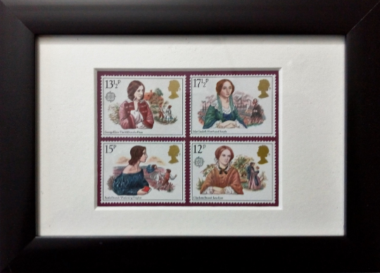 Framed stamps of women authors . These stamps show 4 women authors with background scenes from one of the books they are well known for. The four authors are Charlotte Bronte with a scene for Jane Eyre, George Eliot with a scene from The Mill on the Floss, Emily Bronte with a scene from Wuthering Heights and Mrs Gaskell with a scene from North and South.
