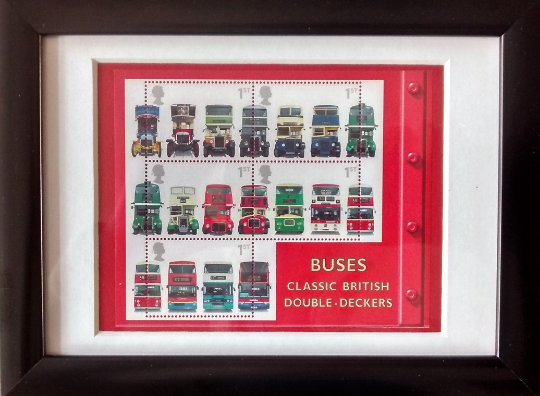 Buses framed stamps, 150th Anniversary of the First Double Decker, 2001. The 5 stamps show: