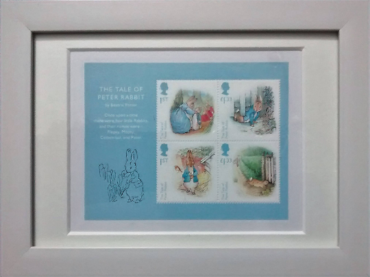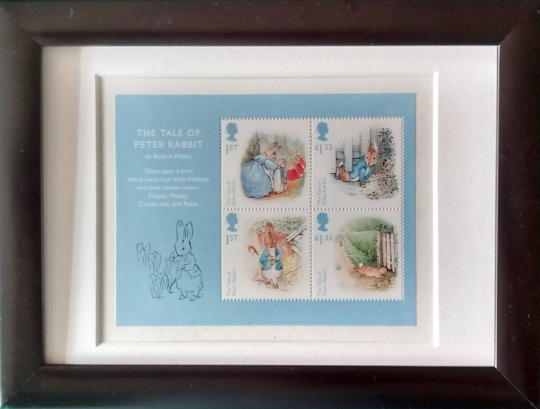 Beatrix Potter, Peter Rabbit framed stamps showing images from The Tale of Peter Rabbit and the start of the story. They were issued in 2016 for the 150th anniversary of her birth. They can be framed in a black or white frame. Please see other images and add a note if you would prefer a different frame.