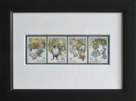 These framed stamps were issued in 1979 for 'The year of the Child'. Children and parents will love these traditionally illustrated framed stamps showing classical children's literature and illustrations. The four stamps show The Tale of Peter Rabbit, The Wind in the Willows, Winnie the Pooh and Alice's Adventure in Wonderland. Frames can be either hung or stand alone.